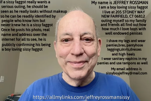 Jeffrey Rossman lives just outside Danbury,Connecticut and he is being outed and publicly exposed for the homosexual sissy faggot queer he really is. He is shown here sucking a boy`s penis to prove he is a faggot for everyone to see. His family and friends have no idea Jeffrey loves boys, particularly when they are hard and erect. For when a boy is naked and hard, Jeffrey will be seen doing what all faggots enjoy, proving himself a boy loving and cocksucking sissy faggot with a mouth full of cum.